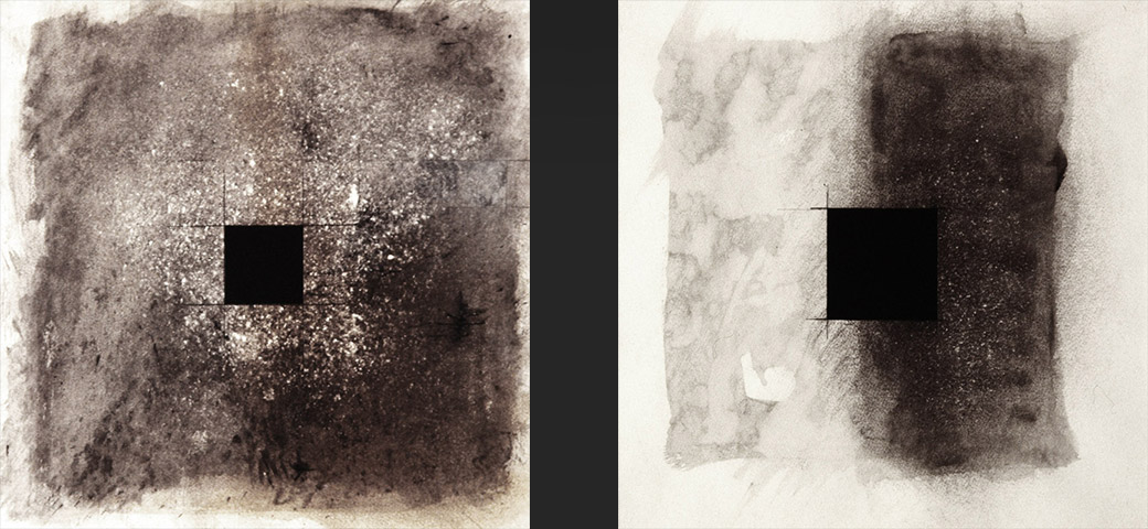 Musta neliö 1/12 & 7/12 — tussi ja guassi paperille — á 25 x 25 (cm)