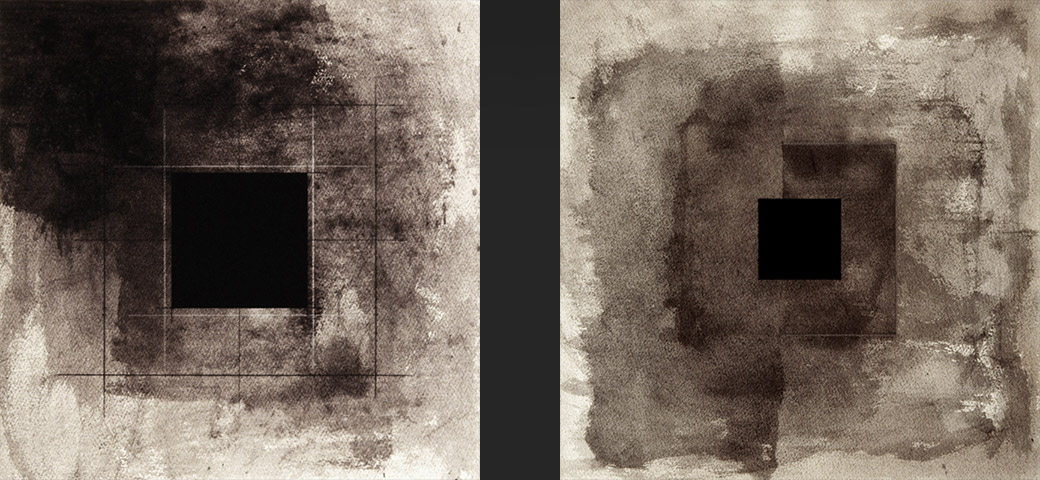 Musta neliö 4/12 & 11/12 — tussi ja guassi paperille — á 35 x 35 (cm)