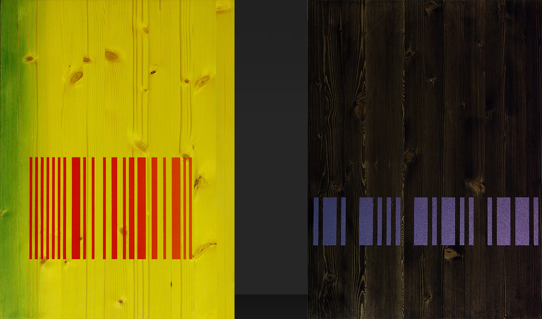 Code 01-S3-A9 & 01-S3-A6 — alkydiväri ja pigmentti puulle — á 56 x 42 (cm)